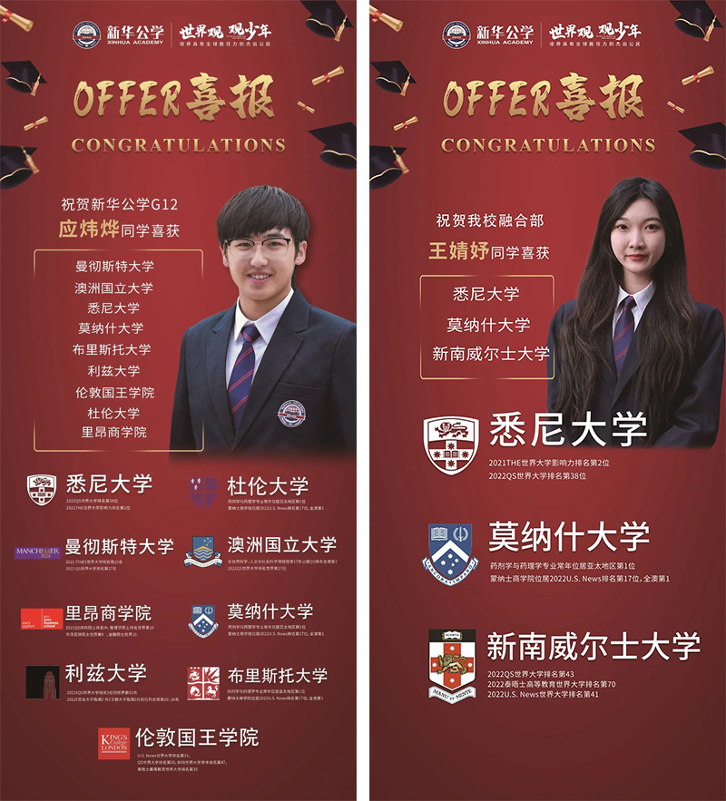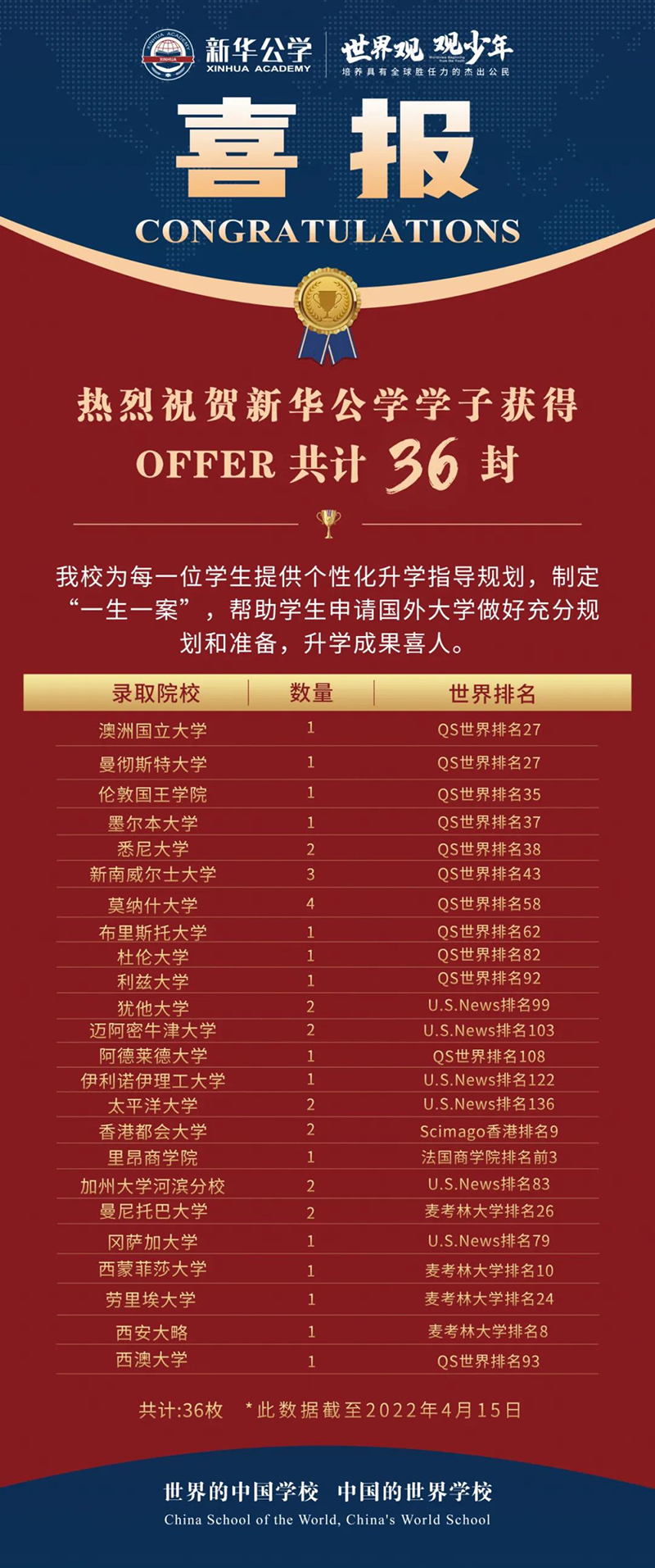 在競爭異常激烈的申請(qǐng)季里,新華學(xué)子表現(xiàn)不俗,收獲了豐碩的成果。2021-2022學(xué)年新華公學(xué)迎來首屆12年級(jí)畢業(yè)生,9名學(xué)生一共收獲36枚Offer,其中不乏世界TOP10名校。
