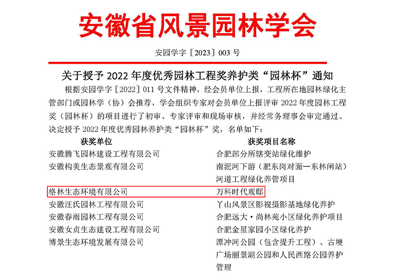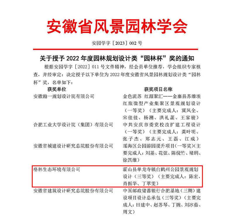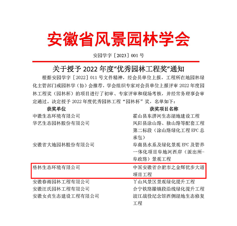 時光不負(fù)努力,付出皆有所獲。近日,2022年度安徽省風(fēng)景園林學(xué)會“園林杯”獎評審結(jié)果正式出爐,格林生態(tài)環(huán)境有限公司喜報(bào)頻傳,共斬獲三項(xiàng)榮譽(yù):2022年度優(yōu)秀養(yǎng)護(hù)類“園林杯”獎、安徽省風(fēng)景園林規(guī)劃設(shè)計(jì)類“園林杯”獎、優(yōu)秀園林工程“園林杯”獎。