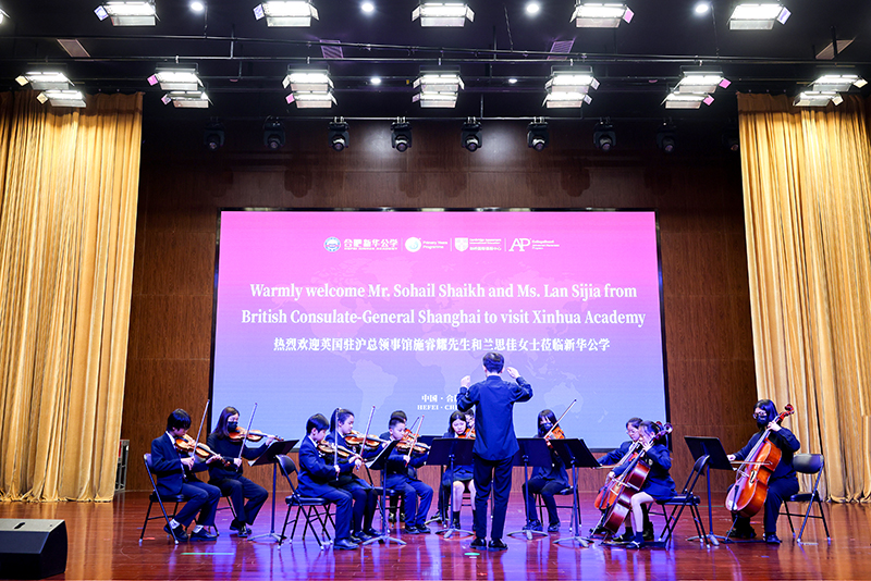 5月25日下午14:00時(shí),英國商業(yè)貿(mào)易部公使銜參贊施睿耀先生、英國商業(yè)貿(mào)易部教育與技能司高級(jí)貿(mào)易投資官蘭思佳女士一行來訪,合肥市教育局辦公室張媛主任陪同,新華公學(xué)總校長秦新春、融合部校長溫晨瑋、行政副校長吳晶晶等校領(lǐng)導(dǎo)熱情接待。首先在報(bào)告廳舉行了簡(jiǎn)單的歡迎儀式,新華國際青少年樂團(tuán)用精彩的表演對(duì)來訪嘉賓表示了熱烈的歡迎。