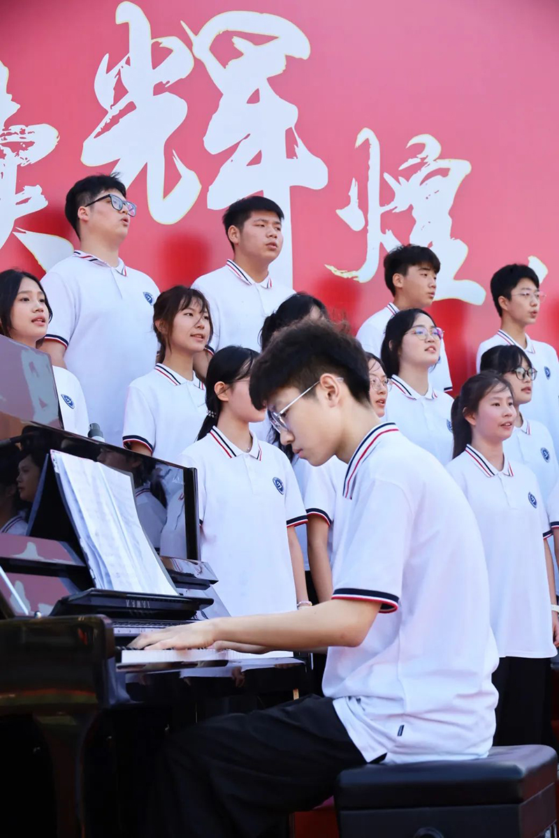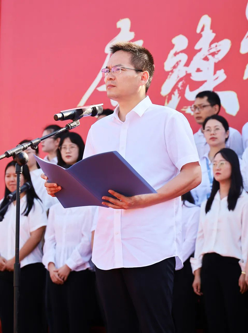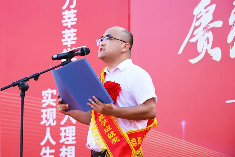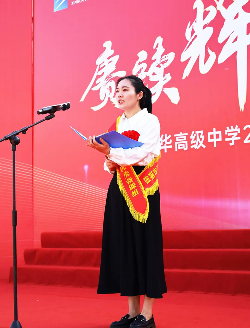 優秀教職工代表宣夢玲老師發言。她希望高一年級同學能在新的征程上努力拼搏,以實際行動追逐夢想,并寄語高二、高三年級同學“筑夢”、“圓夢”,擁抱青春,挑戰自我,實現人生價值。