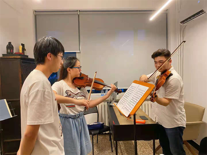 7月17號兩位同學到達北京,我們邀請到中央音樂學院副教授、“琥珀四重奏”中提琴演奏家,德國柏林藝術大學博士獨奏家文憑獲得者戚望教授給兩位同學進行賽前指導。戚望教授在指導中指出合作的意義,并針對兩位同學的不足進行了示范以及講解,并且為兩位選手加油鼓勁。