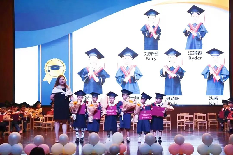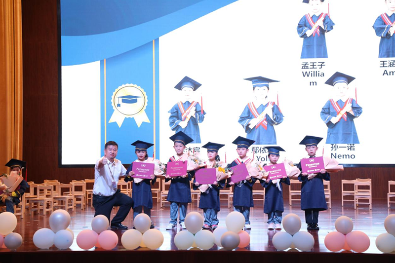 張寧校長(zhǎng)、溫晨瑋校長(zhǎng)和萬(wàn)毅園長(zhǎng)為大班的孩子們頒發(fā)畢業(yè)證書。