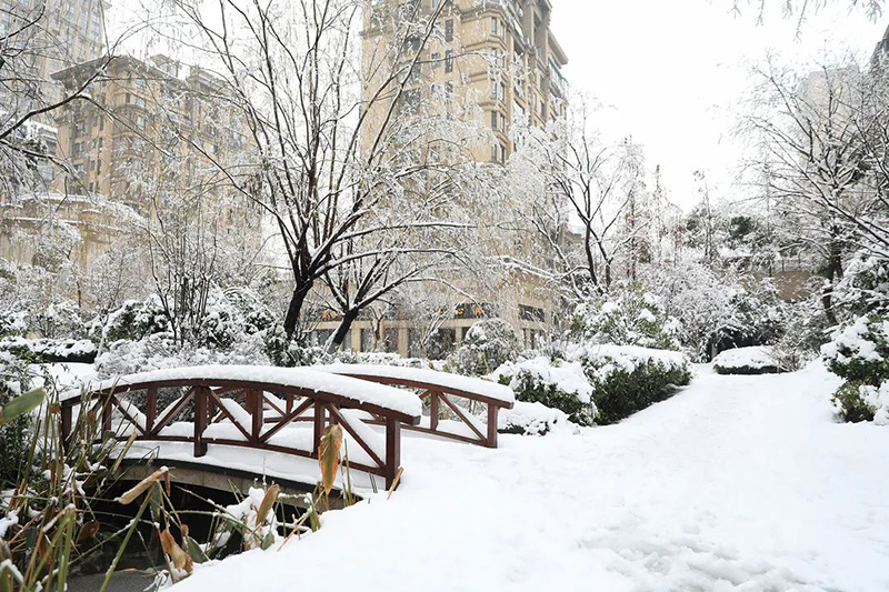 水面上結了晶瑩的冰紋,洋洋灑灑的白色“羽毛”,為華地社區蓋上了一層薄薄的“天鵝絨”。堆雪人,打雪仗,成為了社區里充滿趣味的風景。
