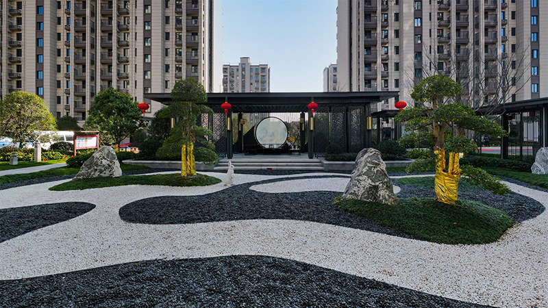 華地以門為界,輔以綠植綠化及水景小品,劃界社區內外兩重境界,一重門樓成為城市與“謐境”的分界線,疏密有致的樹叢隔離喧囂,營造一方靜謐天地。