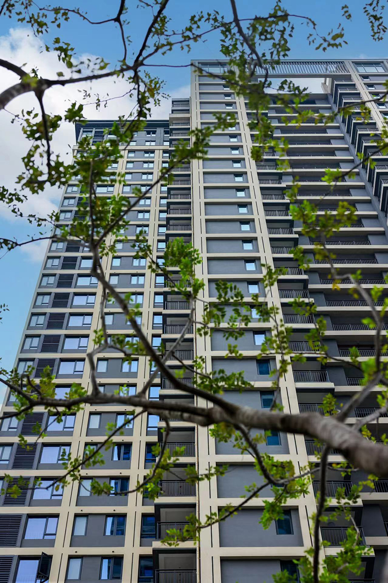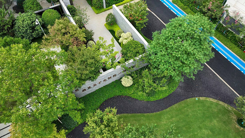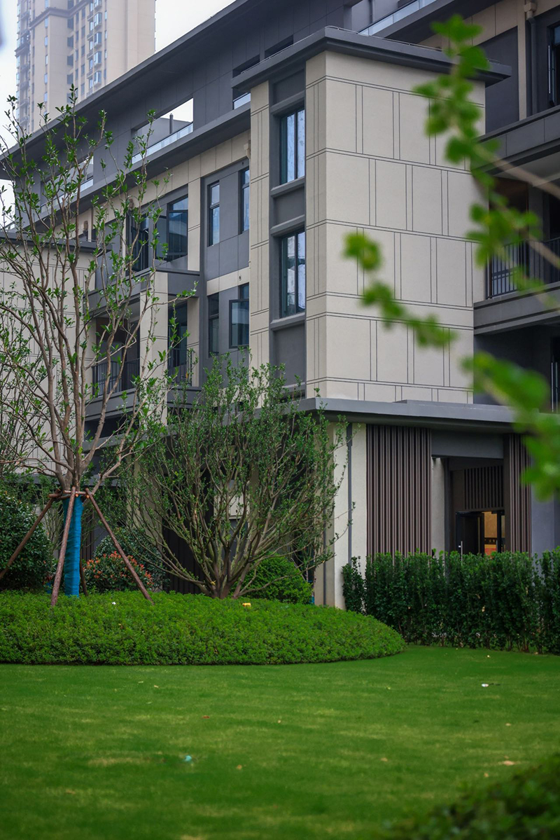 從方寸間的圖紙到漸露新姿的建筑,有序營造出歷久彌新的時代美學。簡約時尚的立面線條呈現建筑的挺拔感,于自然濃蔭中安靜掩映,盡顯清幽寧和。
