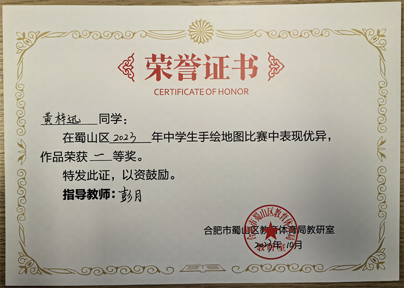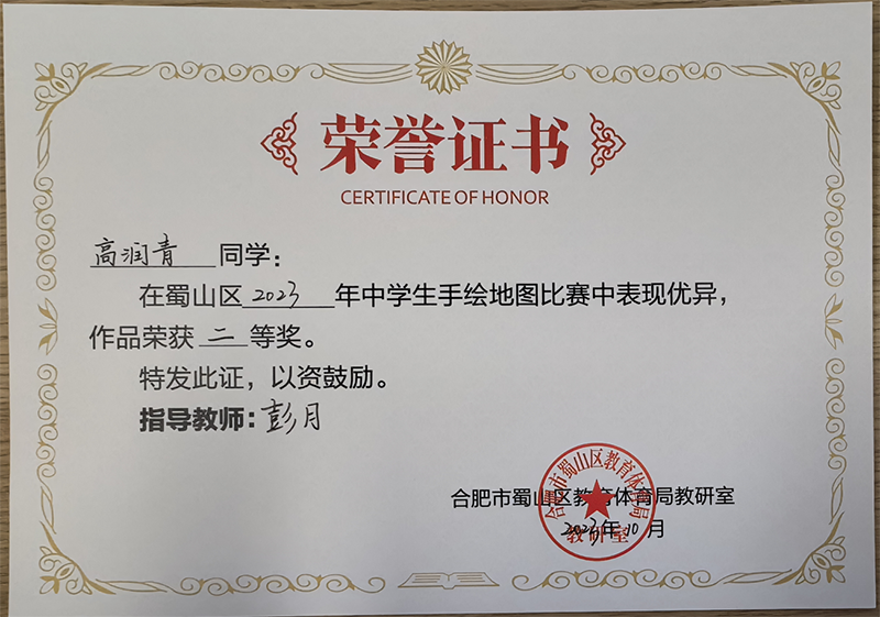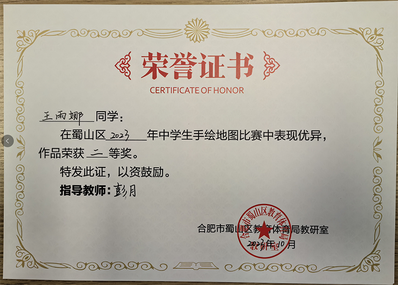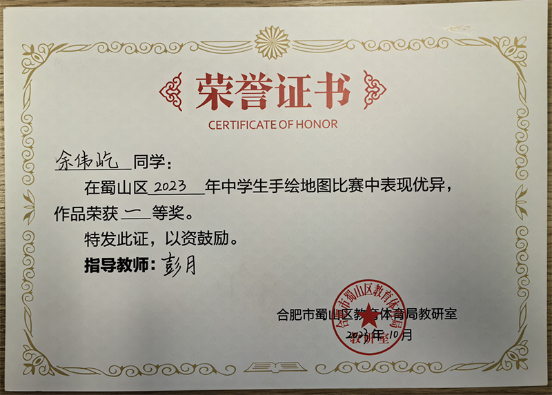 為了落實新課程標準,提升學生地理學科素養(yǎng),增強學生的版圖意識,在國慶之際,蜀山區(qū)舉辦了地理學科2023年蜀山去中學生手繪地圖比賽。新華公學積極響應,參加了本次比賽并取得了優(yōu)異成績。