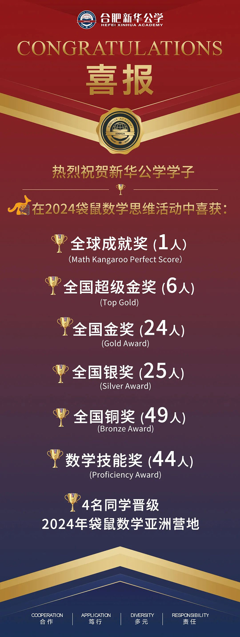 最后,再次祝賀所有獲獎(jiǎng)同學(xué)與參賽同學(xué)!對(duì)數(shù)學(xué)的興趣只是起點(diǎn),而在自己感興趣的領(lǐng)域深入鉆研、甚至選擇了高出自身年級(jí)的難度等級(jí)來挑戰(zhàn)自己,這樣的自信力與勇氣更為可貴!我們希望參賽的每一位新華學(xué)子,都能因這樣亮眼的成績而獲得成就感,在以后的學(xué)習(xí)中充滿動(dòng)力、再創(chuàng)佳績!