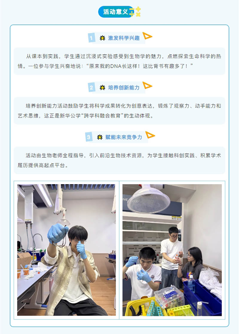 這場(chǎng)活動(dòng)不僅是生物實(shí)驗(yàn),更是一次科學(xué)與藝術(shù)的跨界創(chuàng)作。通過(guò)親手操作,學(xué)生理解了基因的微觀奧秘,同時(shí)將抽象的科學(xué)概念轉(zhuǎn)化為可觸摸的創(chuàng)意作品,真正實(shí)現(xiàn)了“知識(shí)可視化”!